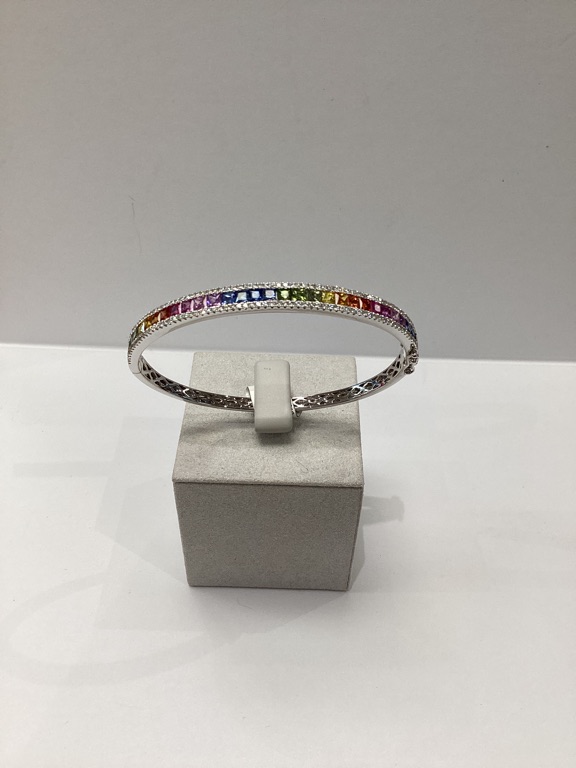 Stand out from the crowd with this show-stopping rainbow sapphire & diamond bangle. It has been beautifully crafted with 4.64ct of vibrant princess cut sapphires and 0.91ct brilliant round bright white diamonds, in a claw setting. The bangle is hinged making it easy to put on and take off and has an addition feature of a double safety fastener.